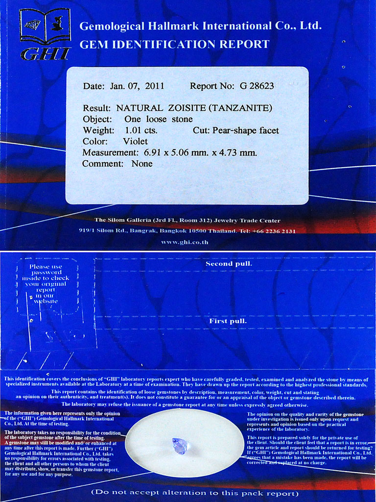 Certified 1.01 Ct. Pear Shape Natural Gem Violet Tanzanite Gem From Tanzania