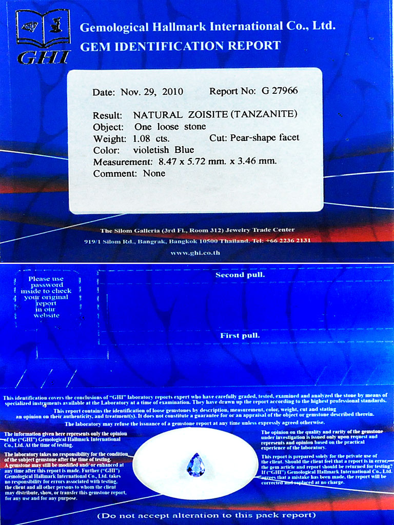 Certified 1.08 Ct. Pear Natural Violetish Blue Tanzanite