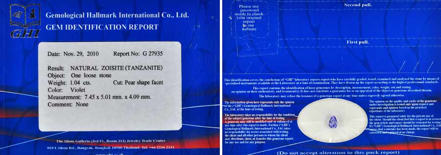 Certified 1.04 Ct. Pear Shape Natural Violet Tanzanite Gem