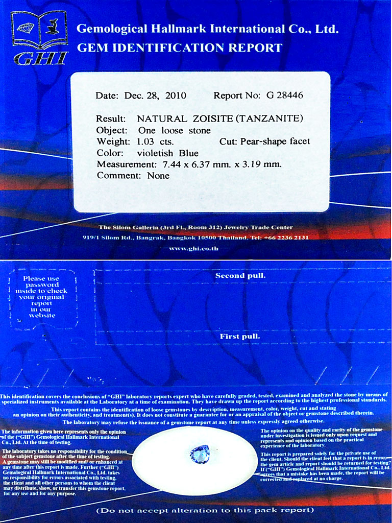 Certified 1.03 Ct. Clean Pear Shape Natural Gem Violetish Blue Tanzanite