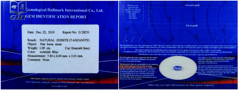 Certified Violetish Blue Tanzanite 1.09 Ct. Octagon 7.84 x 4.69 Mm. Natural Gem