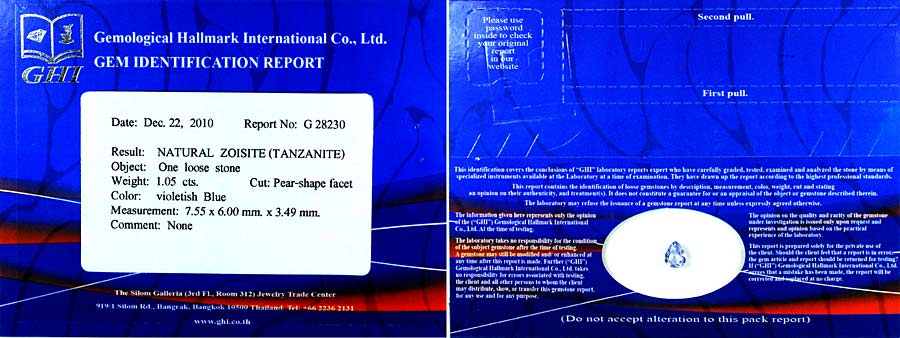 Certified 1.05 Ct. Pear Shape Natural Gem Violetish Blue Tanzanite From Tanzania