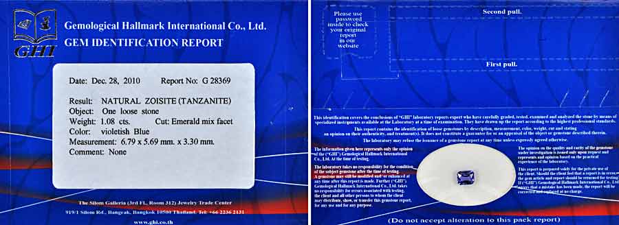 Certified Violetish Blue Tanzanite 1.08 Ct. Octagon 6.79 x 5.69 Mm. Natural Gem