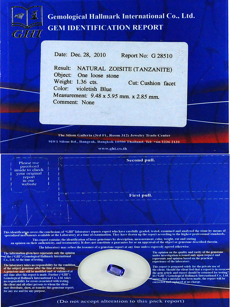 Certified 1.36 Ct. Cushion Shape Natural Gem Violetish Blue Tanzanite