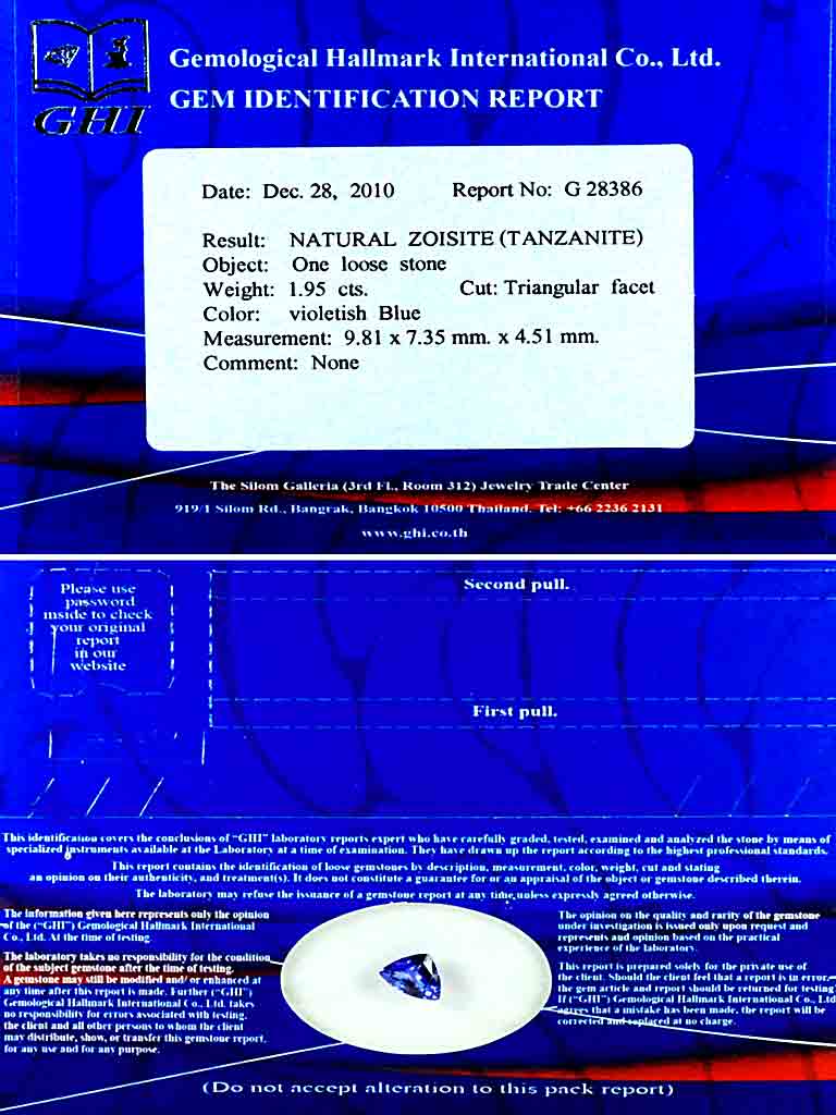 Certified Violetish Blue Tanzanite 1.95 Ct. Clean Trilliant Natural Gemstone