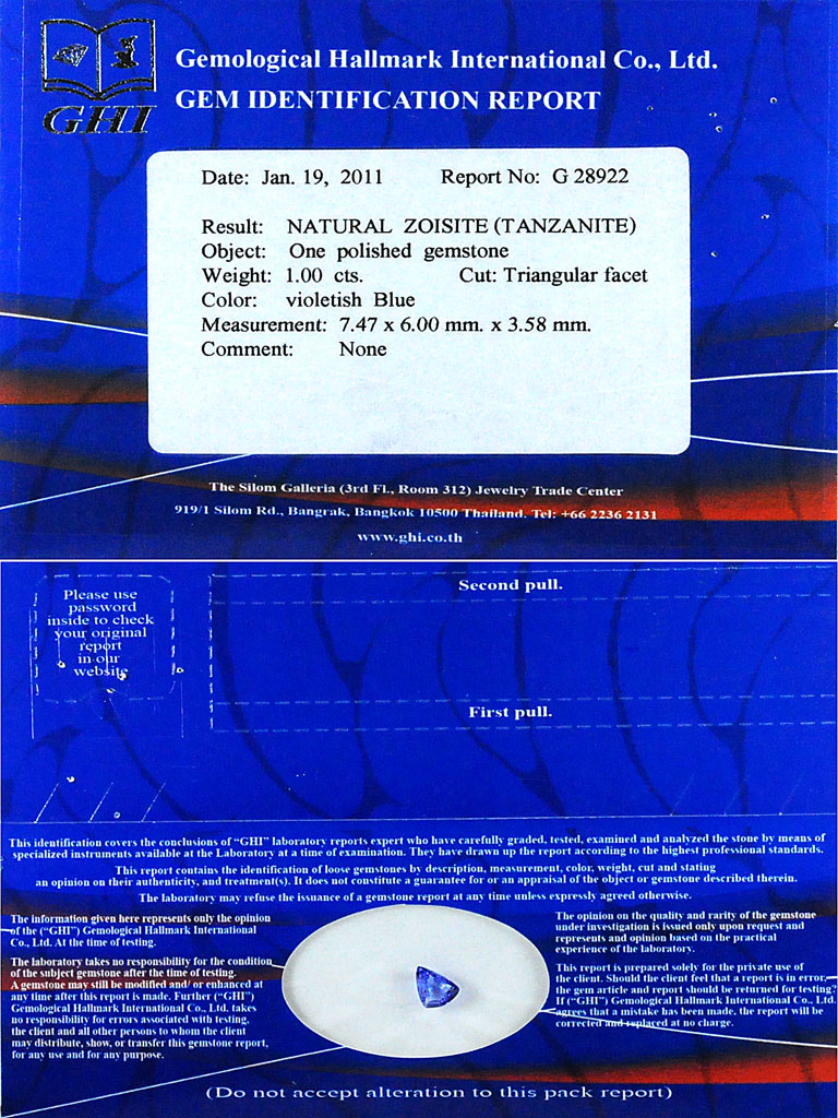 Certified 1.00 Ct. Trilliant Shape Natural Gem Violetish Blue Tanzanite