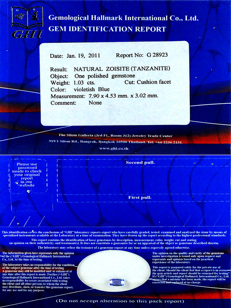 Certified Violetish Blue 1.03 Ct. Cushion Shape 7.90 x 4.53 Mm. Natural Gemstone