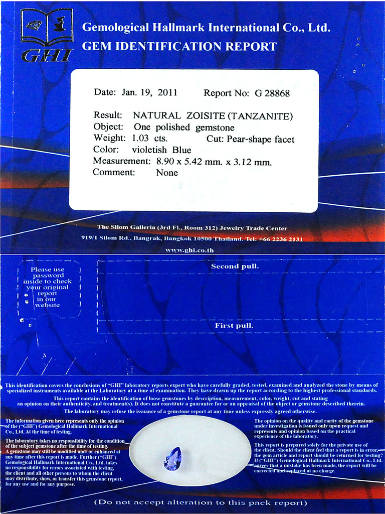 Certified 1.03 Ct. Pear Shape Natural Gem Violetish Blue Tanzanite From Tanzania