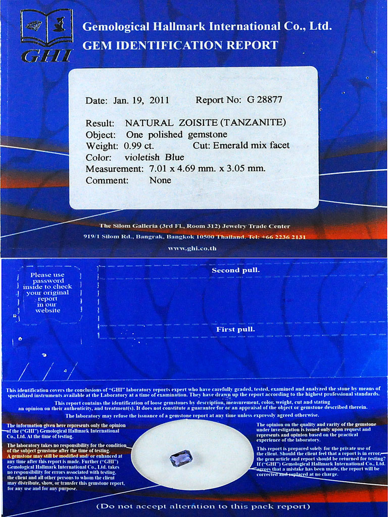 Certified 0.99 Ct. Clean Natural Gem Violetish Blue Tanzanite From Tanzania