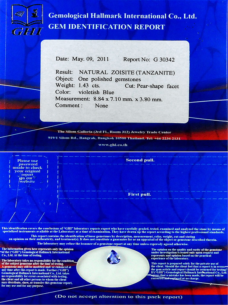 Certified Violetish Blue Tanzanite 1.43 Ct Clean Pear 8.84 x 7.10 Mm Natural Gem