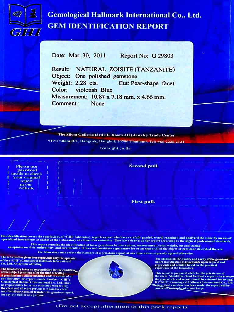 Certified Violetish Blue Tanzanite 2.28 Ct. Clean Pear 10.87 x 7.18 Mm. Natural