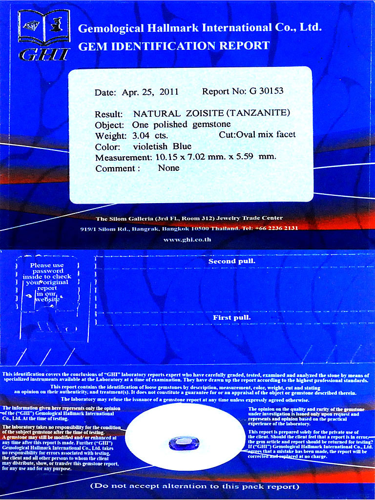 Certified Violetish Blue Tanzanite 3.04 Ct. Clean Oval 10.15 x 7.02 Mm. Natural
