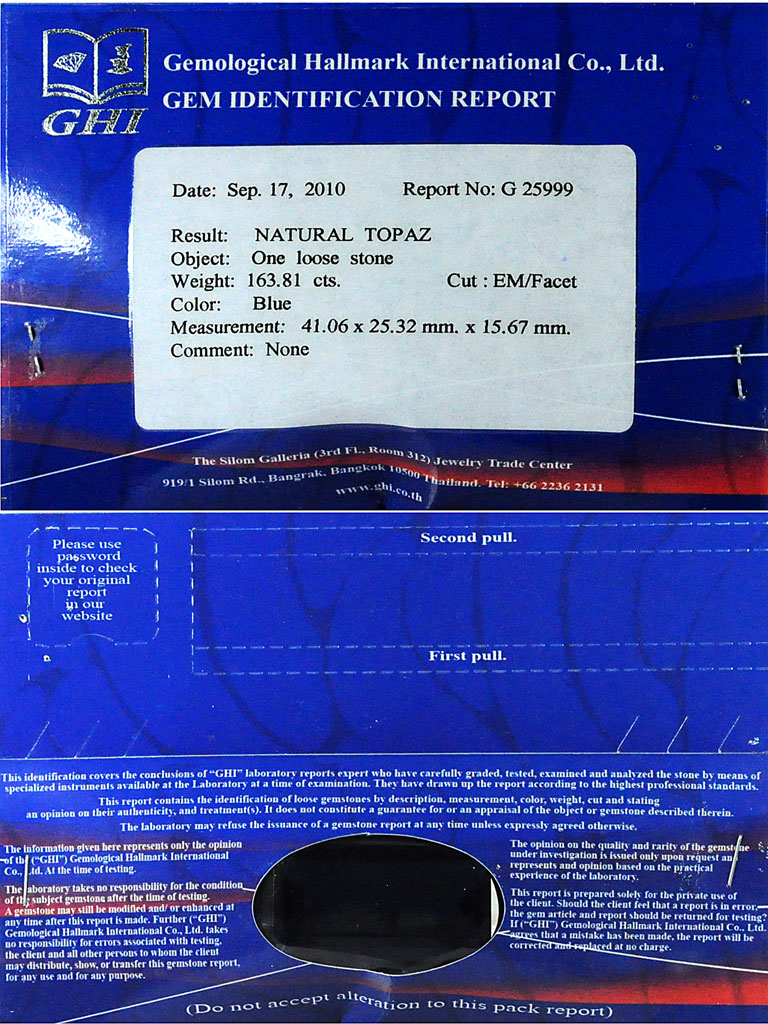 Certified London Blue Topaz 163.81 Ct. Clean Octagon 41.06 x 25.32 Mm. Natural