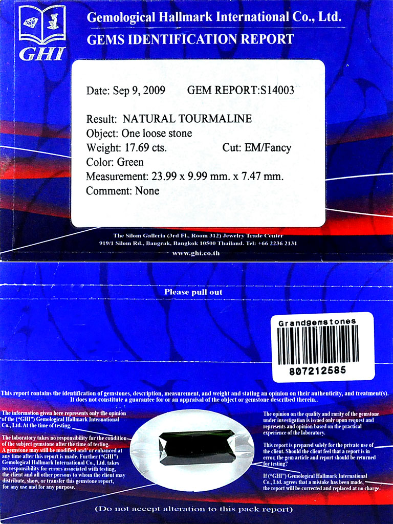 Certified Natural Gemstone 17.69 Ct. Clean Green Tourmaline
