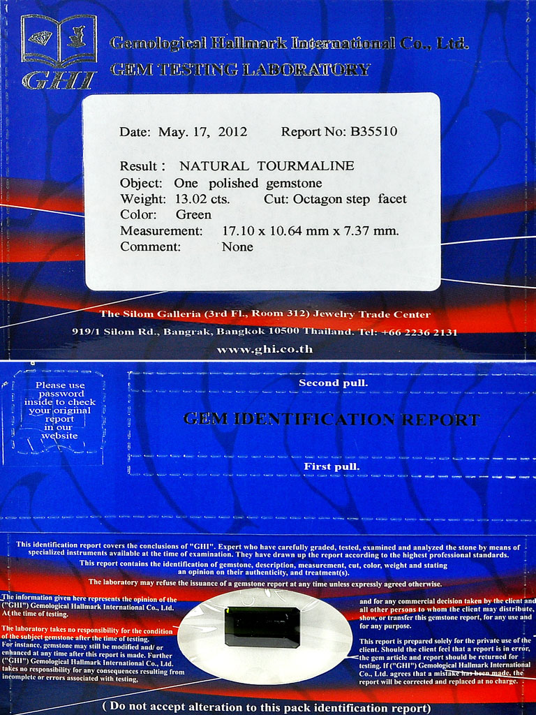 Certified Natural Gemstone 13.02 Ct. Clean Green Tourmaline