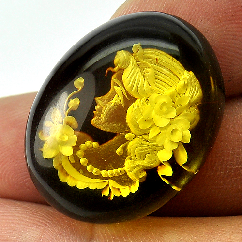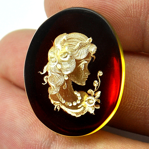 Brown Yellow Amber Carving 15.43 Ct. Oval Cabochon 25 x 20 Mm. Natural Poland