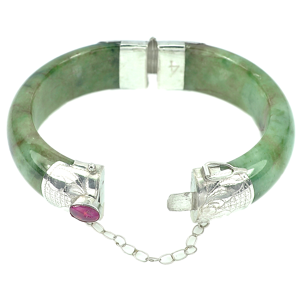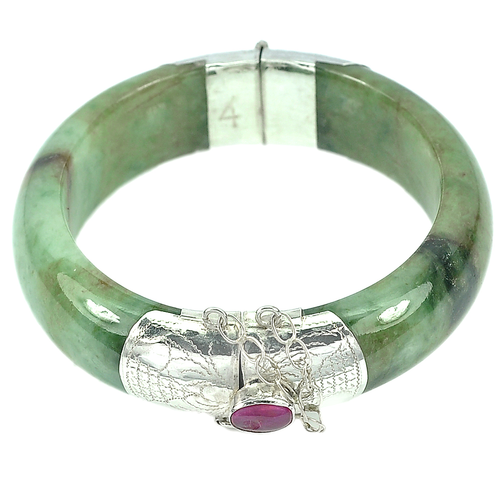 403.22 Ct. Beautiful Natural Green Jade Bangle with Real Silver and Gem Red Ruby