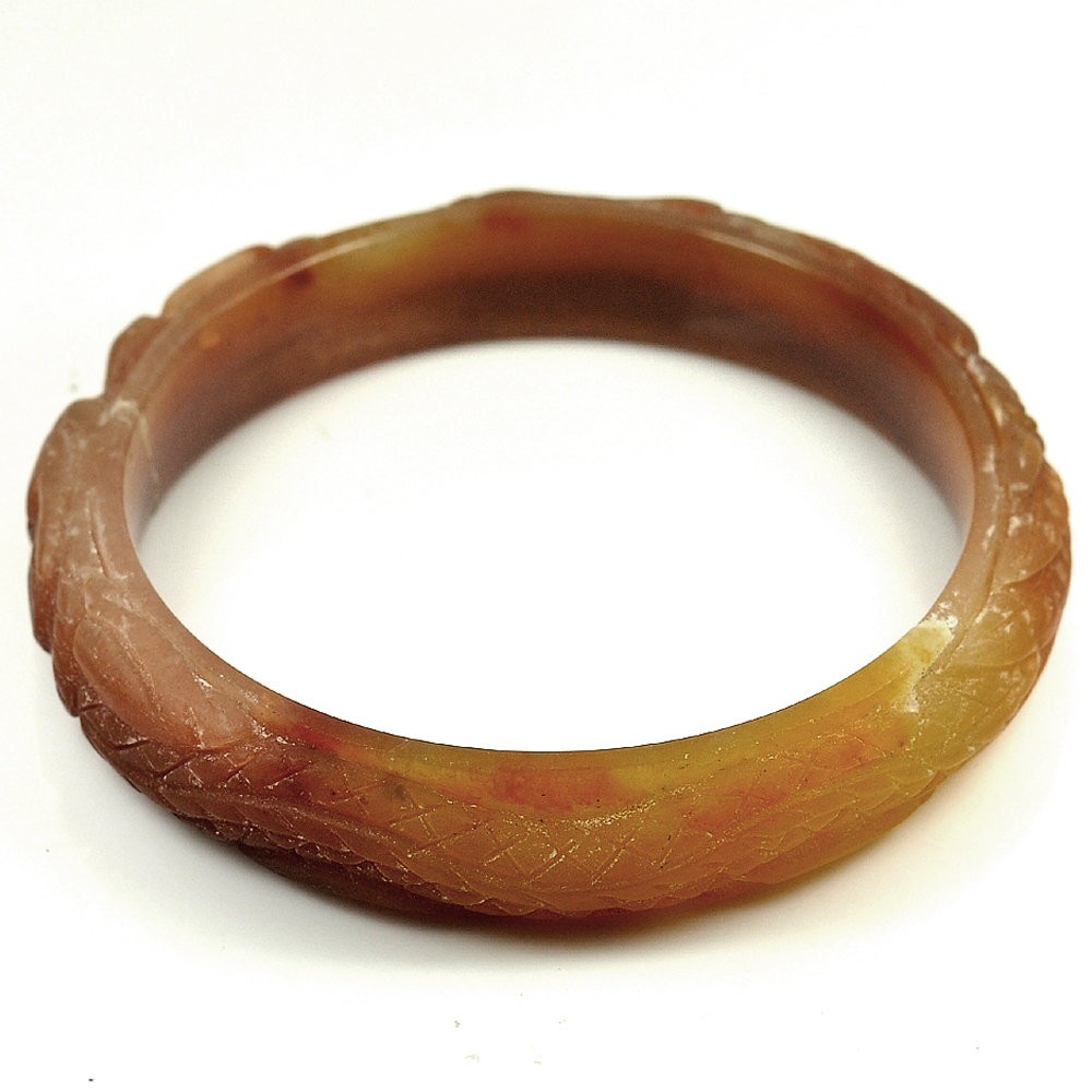 233.91 Ct. Natural Gem Honey Brown Jade Bangle Dragon Carving Size 80x65x13mm.